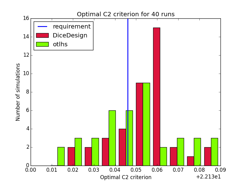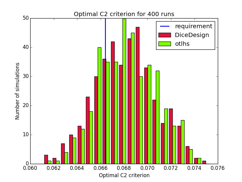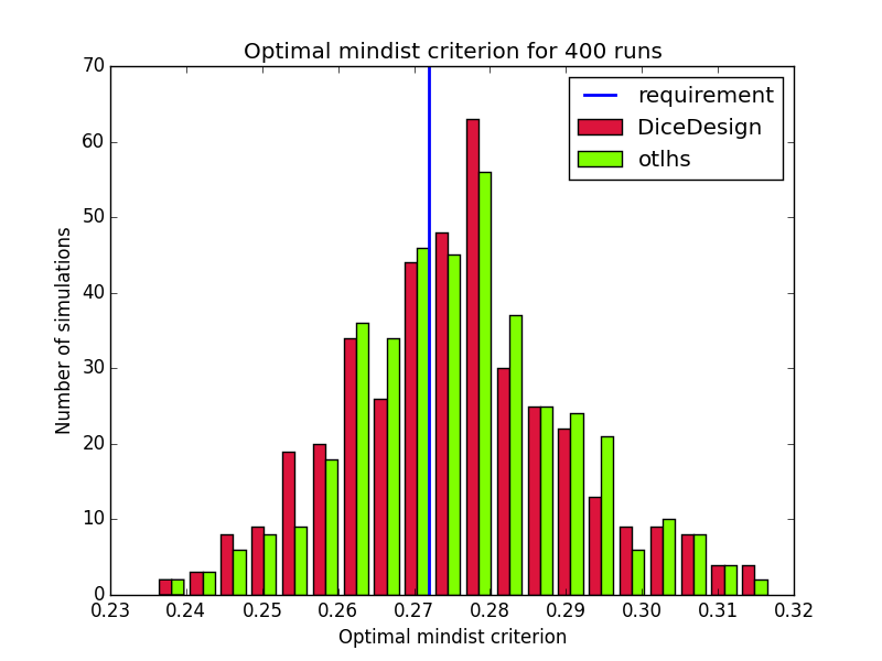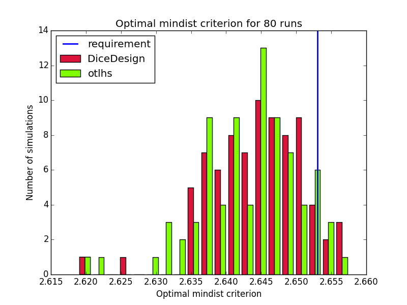 Results are close to expectations, but do not meet all requirements. In order to understand why otlhs results are sometimes out of bounds, we performed 400 runs of tests 1 and 2 with DiceDesign and otlhs, 40 runs of test 3 and 80 runs of test 4. Diagrams look similar, thus in our opinion, otlhs does meet requirements. Moreover, as otlhs is much faster than R, the same CPU budget will give better results with otlhs.