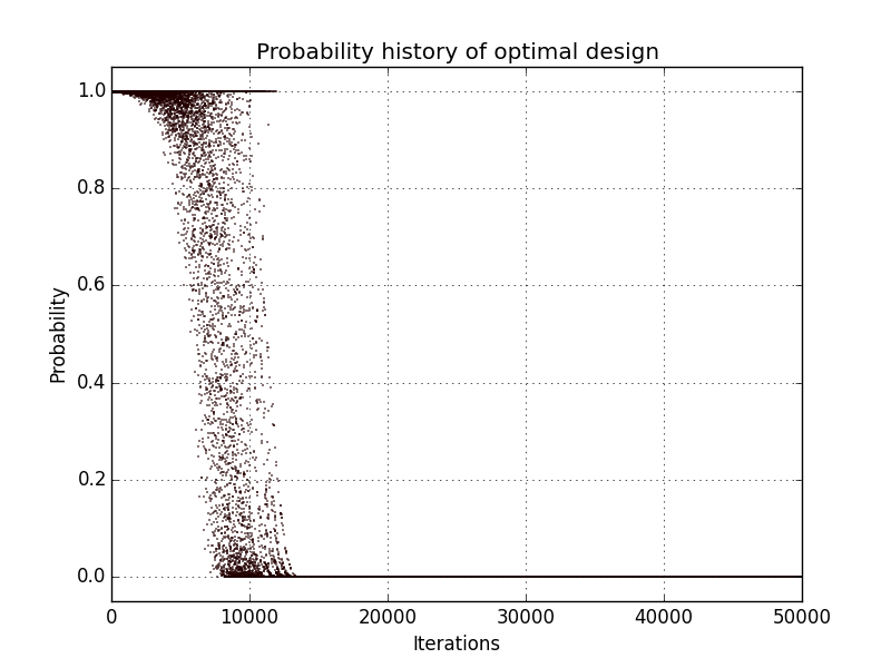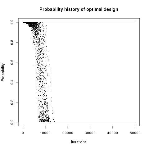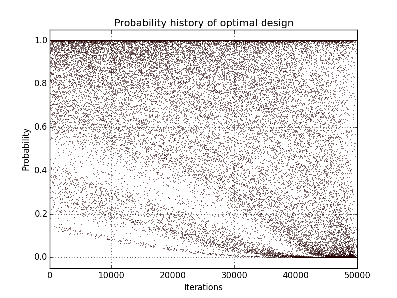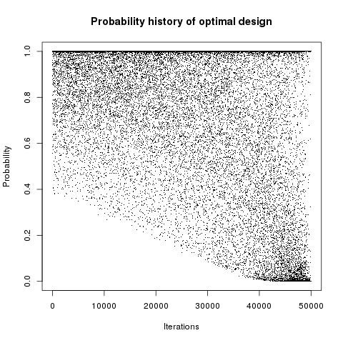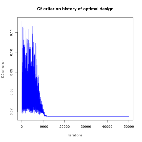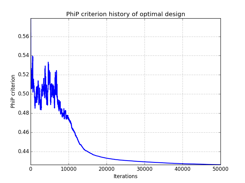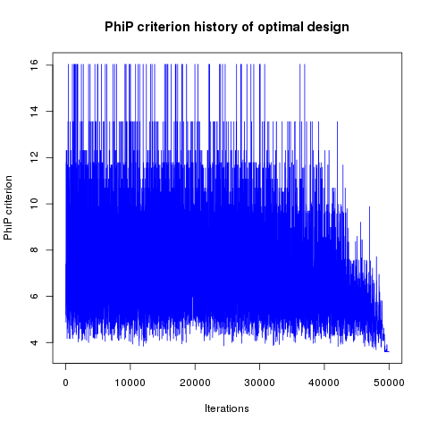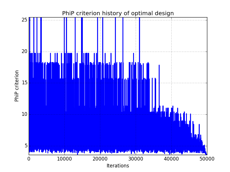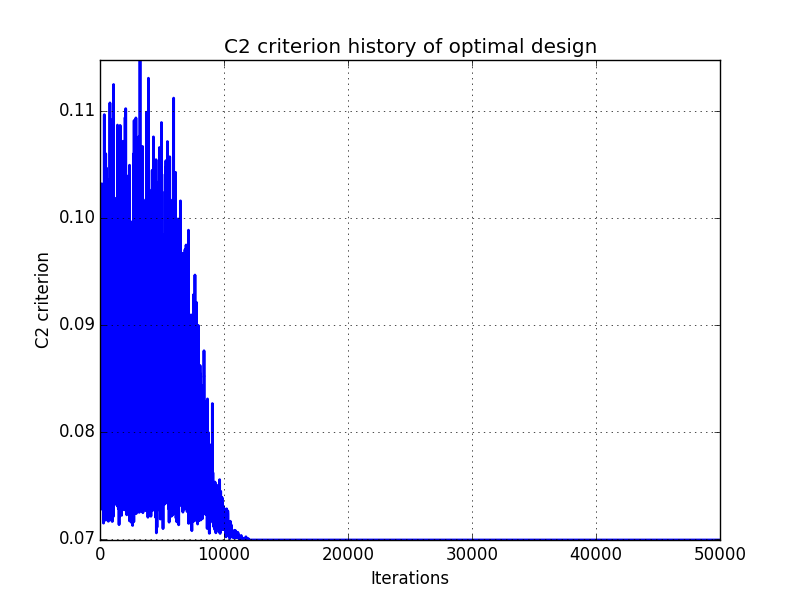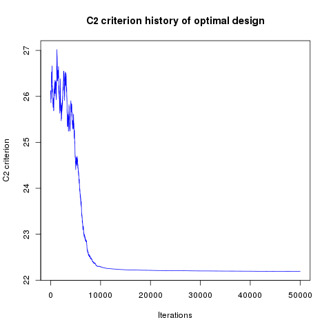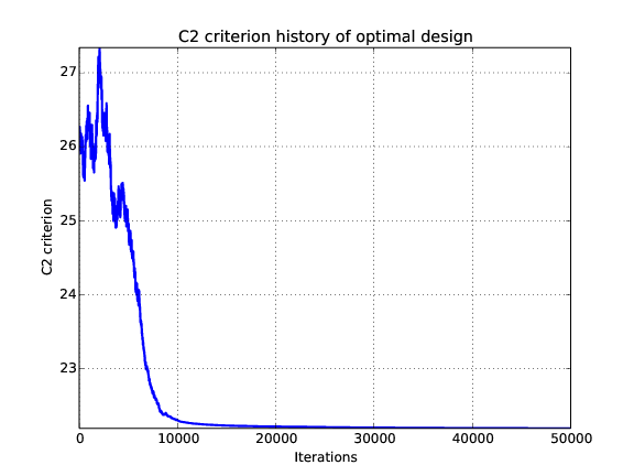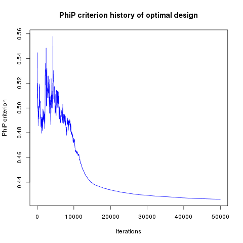 In addition, designs, optimized criterion convergence and elementary perturbation probability are given here: (for dimension 50, only criterion history is displayed).