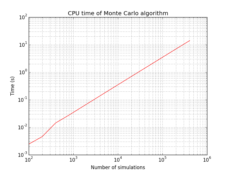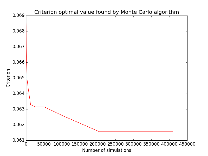 We first check that Monte Carlo scales linearly with respect to the number of simulations. Random generator seed is reinitialized to the same value when starting Monte Carlo algorithm, this is why criterion always decreases.