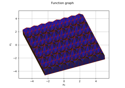 >>> import openturns as ot >>> import otmeshing >>> bbox = ot.Interval([-8] * 2, [8] * 2) >>> inputDiscretization = [10] * 2 >>> mesher = otmeshing.FunctionGraphMesher(bbox, inputDiscretization) >>> f = ot.SymbolicFunction(['x', 'y'], ['cos(x) * sin(y)']) >>> zIndex = 2 # z axis index >>> zMin, zMax = 0.01, 0.3 # clip f in [0.01, 0.3] >>> mesh = mesher.build(f, zIndex, zMin, zMax)