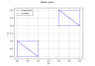 >>> import openturns as ot >>> import otmeshing >>> mesher = otmeshing.UnionMesher() >>> dim = 2 >>> mesh1 = ot.IntervalMesher([1] * dim).build(ot.Interval(dim)) >>> mesh2 = ot.IntervalMesher([1] * dim).build(ot.Interval([2.0] * dim, [3.0] * dim)) >>> union = mesher.build([mesh1, mesh2])